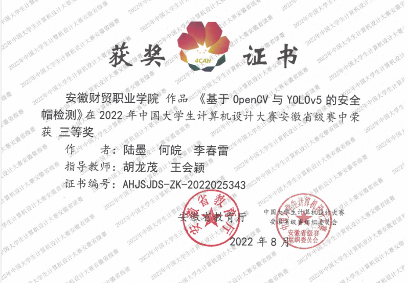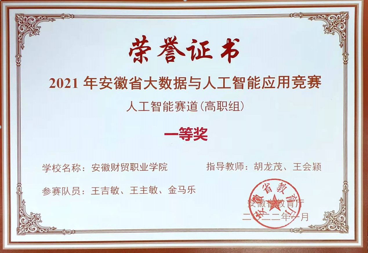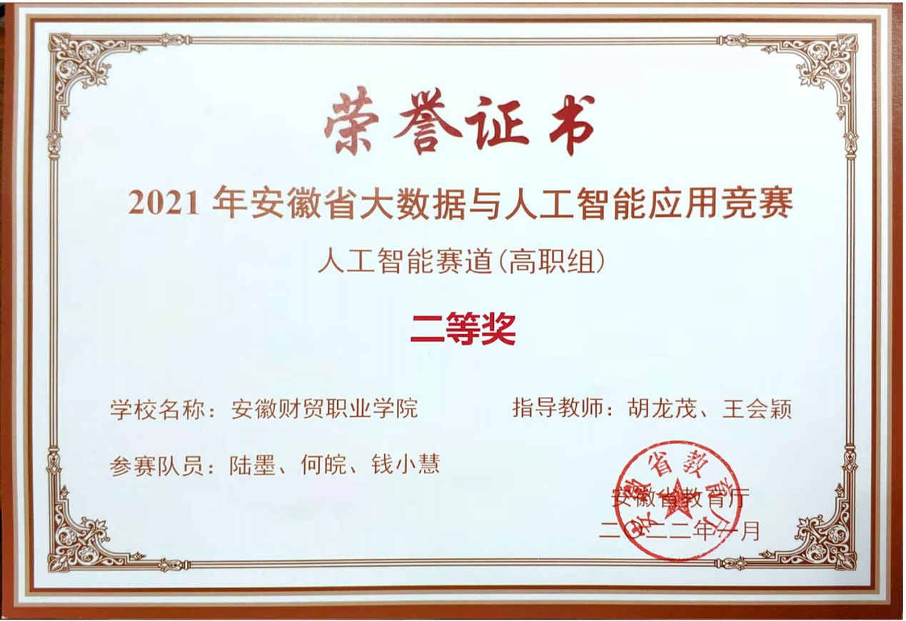 3、2022年1月,2021年安徽省大数据与人工智能应用竞赛获一等奖、二等奖。