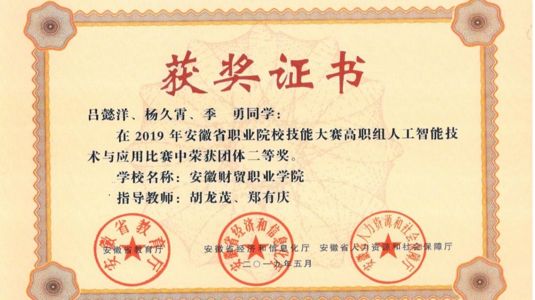 1.2019年,获省职业院校技能大赛“人工智能技术与应用”二等奖。
