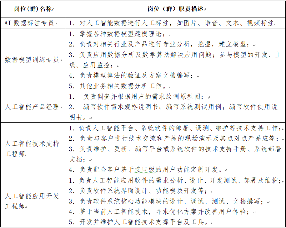 本专业培养拥护党的基本路线,德、智、体、美等全面发展,能够较快适应生产、建设、管理、服务等一线岗位需要的,面向金融、医疗、制造、政府等部门的数据科学、机器学习、数据保护、人工智能运维等相关工作岗位,具有人工智能理论基础知识,掌握人工智能技术的基本技能,了解人工智能技术应用框架与其生态系统,具有较高综合素质与良好职业素养,能从事人工智能应用相关基础工作的高素质技术技能人才。