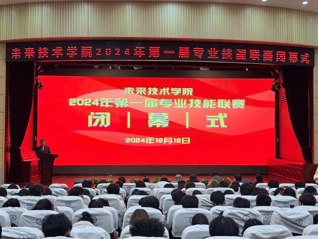 12月18日,未来技术学院在学术报告厅举办2024年第一届专业技能联赛闭幕式。安徽芒课教育科技有限公司副总经理张贵敏受邀出席,未来技术学院院长张成叔、副院长陆慧、教研室主任以及2024级学生代表300余人参加大会。闭幕式由未来技术学院党总支副书记张伟伟主持。