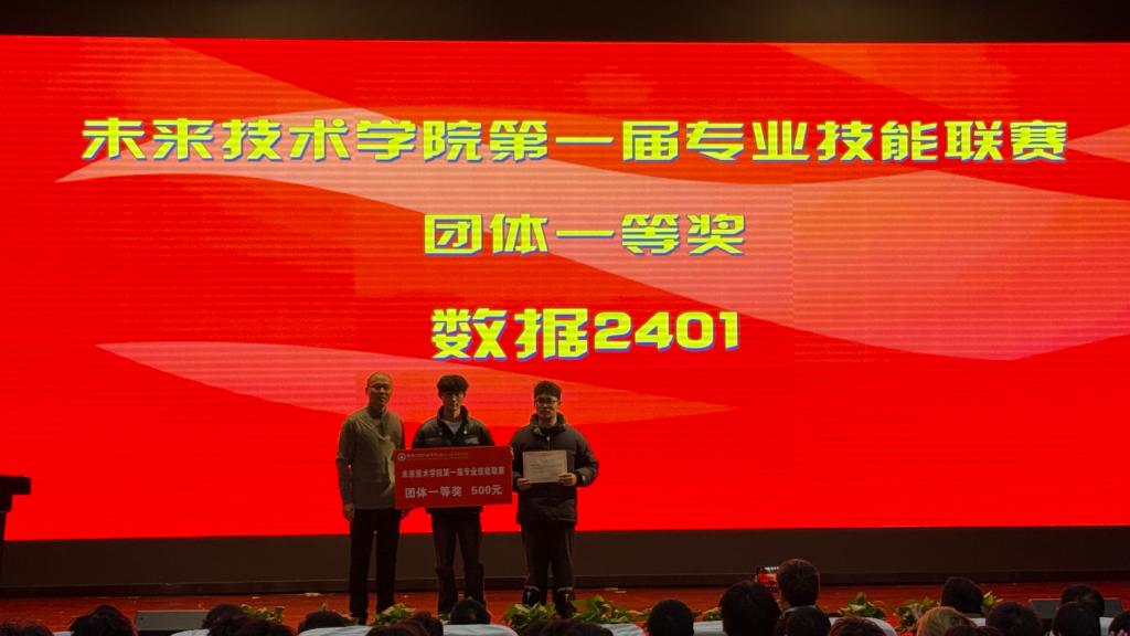 陆慧宣读了《未来技术学院关于公布2024年第一届专业技能联赛获奖名单的通知》。经过激烈角逐,最终决出了个人一等奖8人、二等奖16人、三等奖24人,团体一等奖1个、二等奖2个、三等奖3个。颁奖仪式上,在热烈的掌声中,与会嘉宾为获奖选手及班级代表颁发了荣誉证书和奖金。