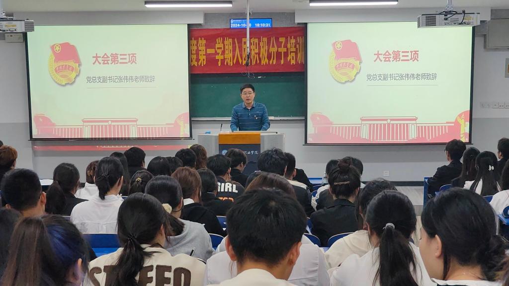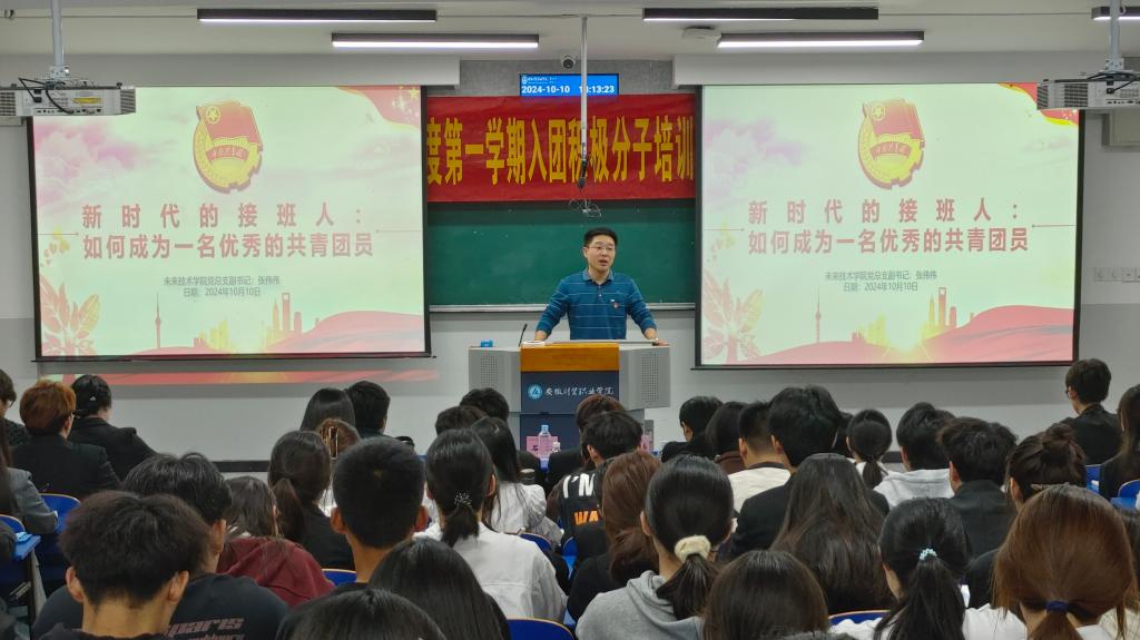 为进一步加强学院共青团组织建设,规范新团员发展工作程序,提升团组织的战斗力和凝聚力,10月10日晚6时,未来技术学院2024-2025学年度第一学期入团积极分子开班仪式暨第一期主题团课在6101教室举行,未来技术学院党总支副书记张伟伟、团总支书记石冰以及入团积极分子、团学干部出席本次活动。