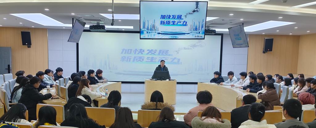 12月12日,未来技术学院党总支副书记张伟伟在A502作“加快发展新质生产力”形势与政策专题报告,未来技术学院23级团学干部和24级递交入党申请书的团员参加报告会。