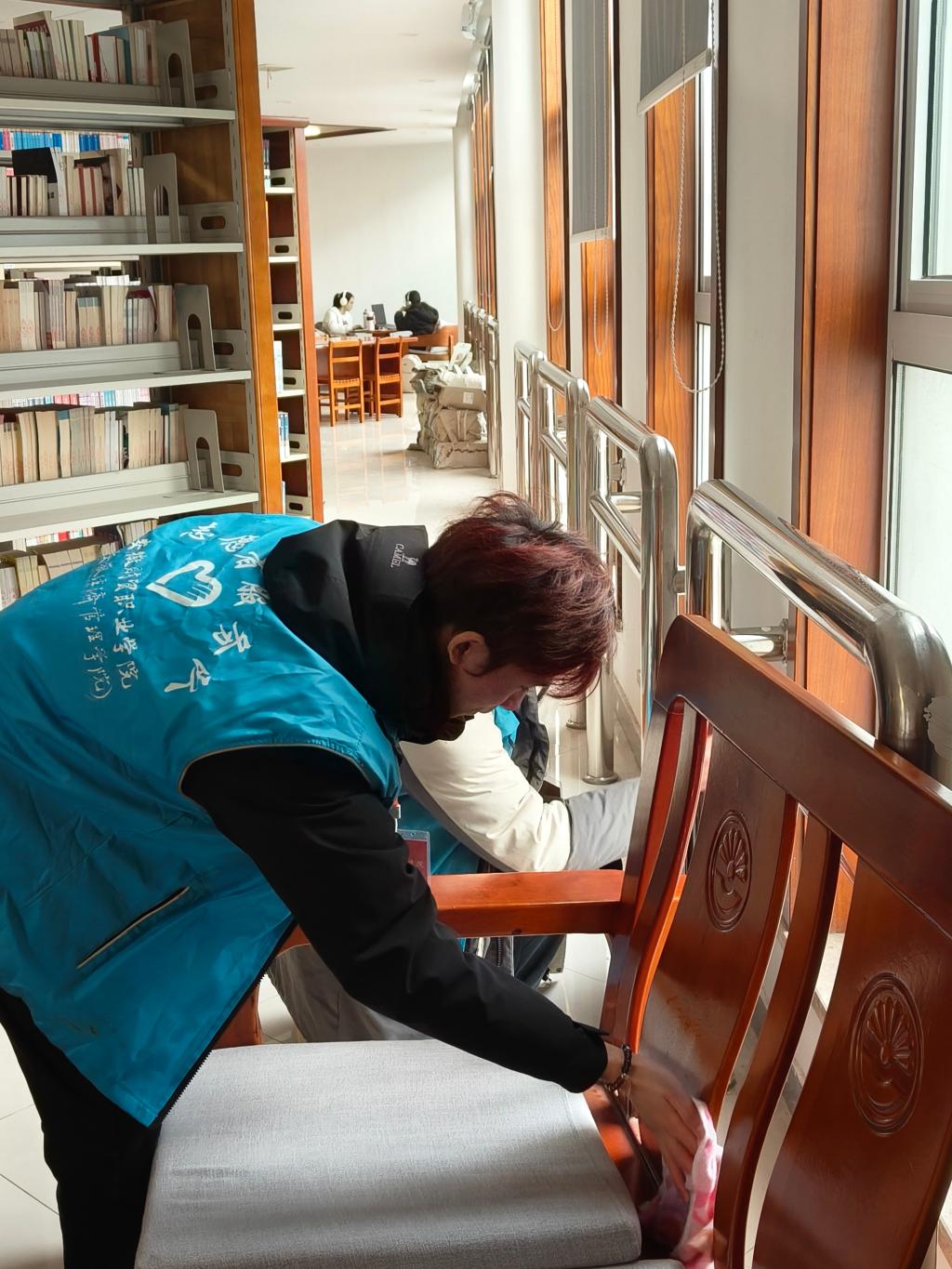 活动现场,志愿者们身着鲜亮的红色志愿马甲,手持清洁工具,按照预先分组迅速投入工作:有的耐心擦拭自助借还书机、公共查询终端等常用设备,让公共设施褪去浮尘、光洁如新;有的在图书馆老师的指导下,对报刊室的杂志、书籍逐一分类整理,将散落的刊物重新归位、排列整齐;有的则重点清理桌椅缝隙、窗台角落等容易被忽略的卫生死角,不放过任何一处积尘和杂物。