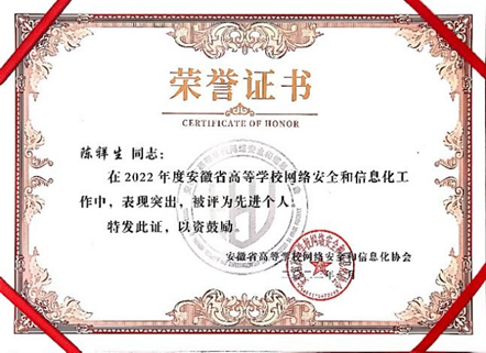 近日,安徽省高等学校网络安全和信息化协会下发了《关于公布2022年度安徽省高等学校网络安全和信息化工作先进集体、先进个人评选结果的通知》文件,学校现代教学技术中心被评为“先进集体”,陈祥生老师被评为2022年度“先进个人”。