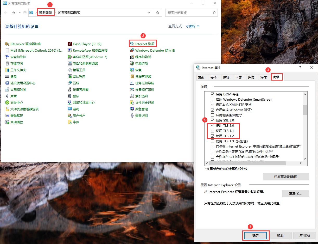 3.部分用户浏览器可能会出现学校网站打不开的情况,此时可清理浏览器缓存,检查浏览器“Internet选项”配置,确保勾选“使用TLS 1.0”、“使用TLS 1.1”和“使用TLS 1.2”,建议同时勾选“使用TLS 2.0”、“使用TLS 3.0”和“使用SSL 3.0”,操作流程如下图所示。