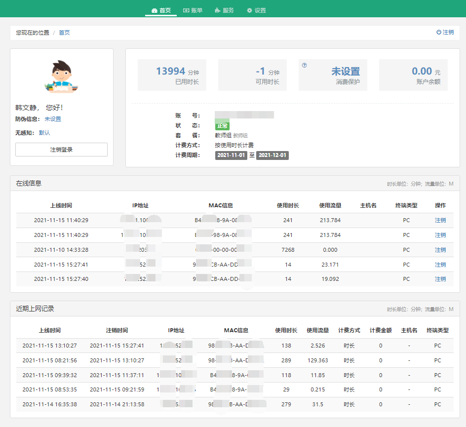 在校园网自助服务系统首页,可以看到自己的基本信息、已使用时长、账户余额、当前在线终端以及近期上网记录。