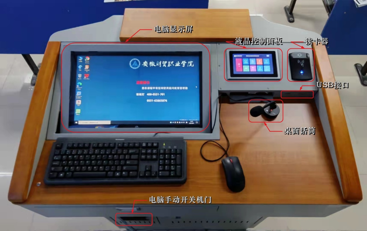 桌面麦克风:放置于讲桌桌面,需老师按下按钮开关(红色框中按钮)启动桌面麦克风;(注:话筒音量放置于讲桌拾音效果最佳,教师无需拿在手上)