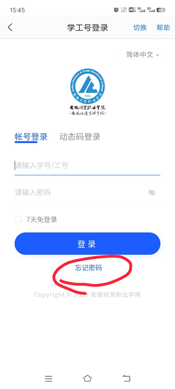1.点击今日校园左下角“学工号”,点击“忘记密码”按钮