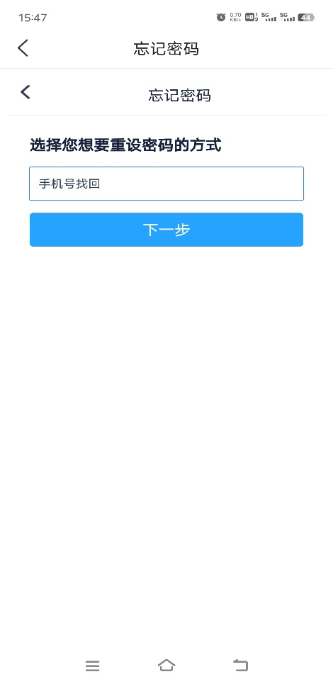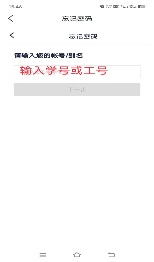 2.学生输入本人学号,教职工输入教职工号。点击下一步选择手机号找回方式