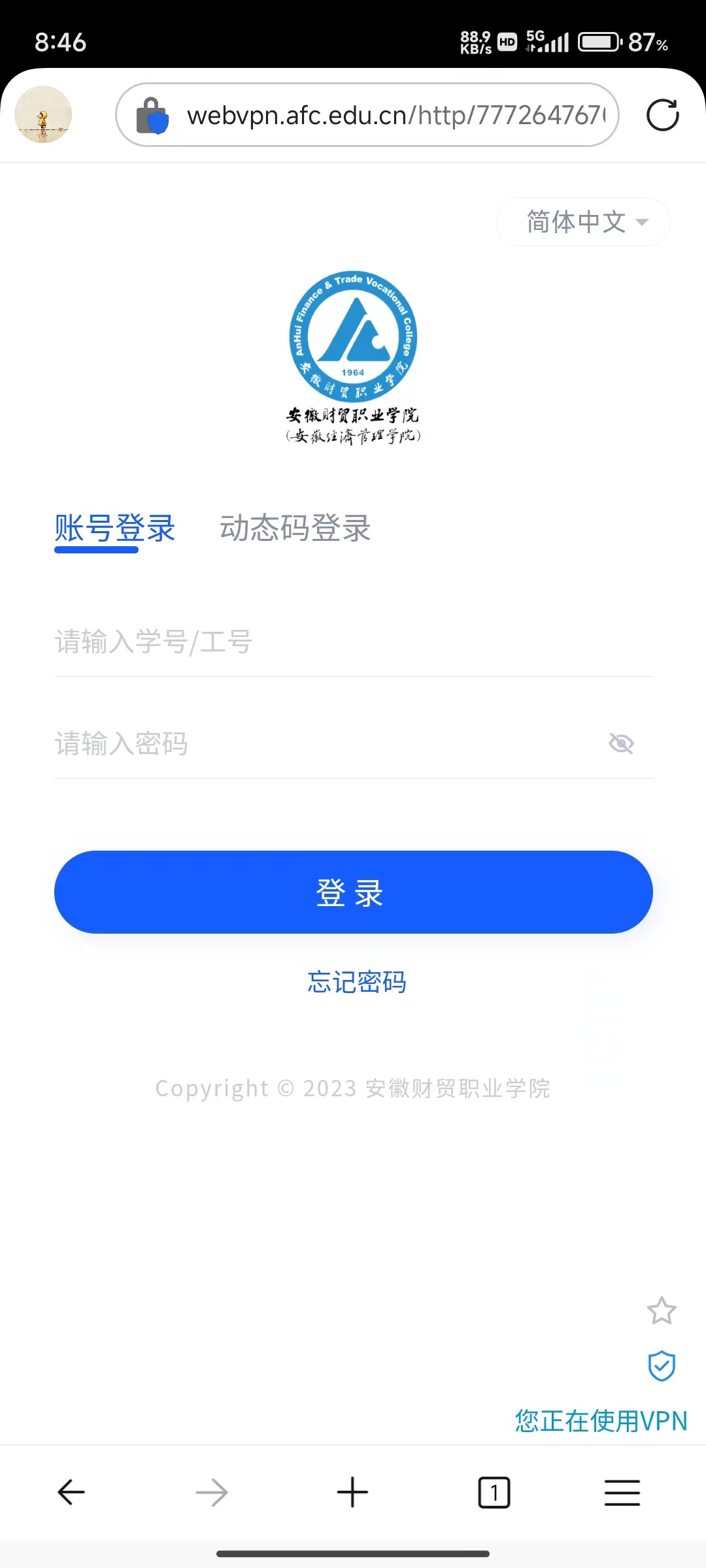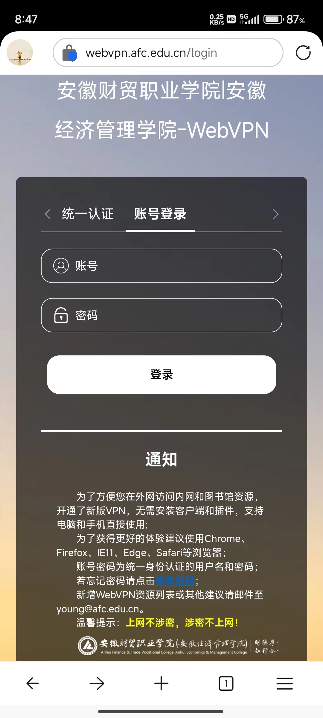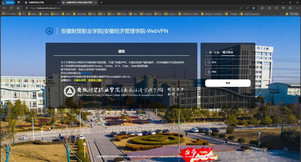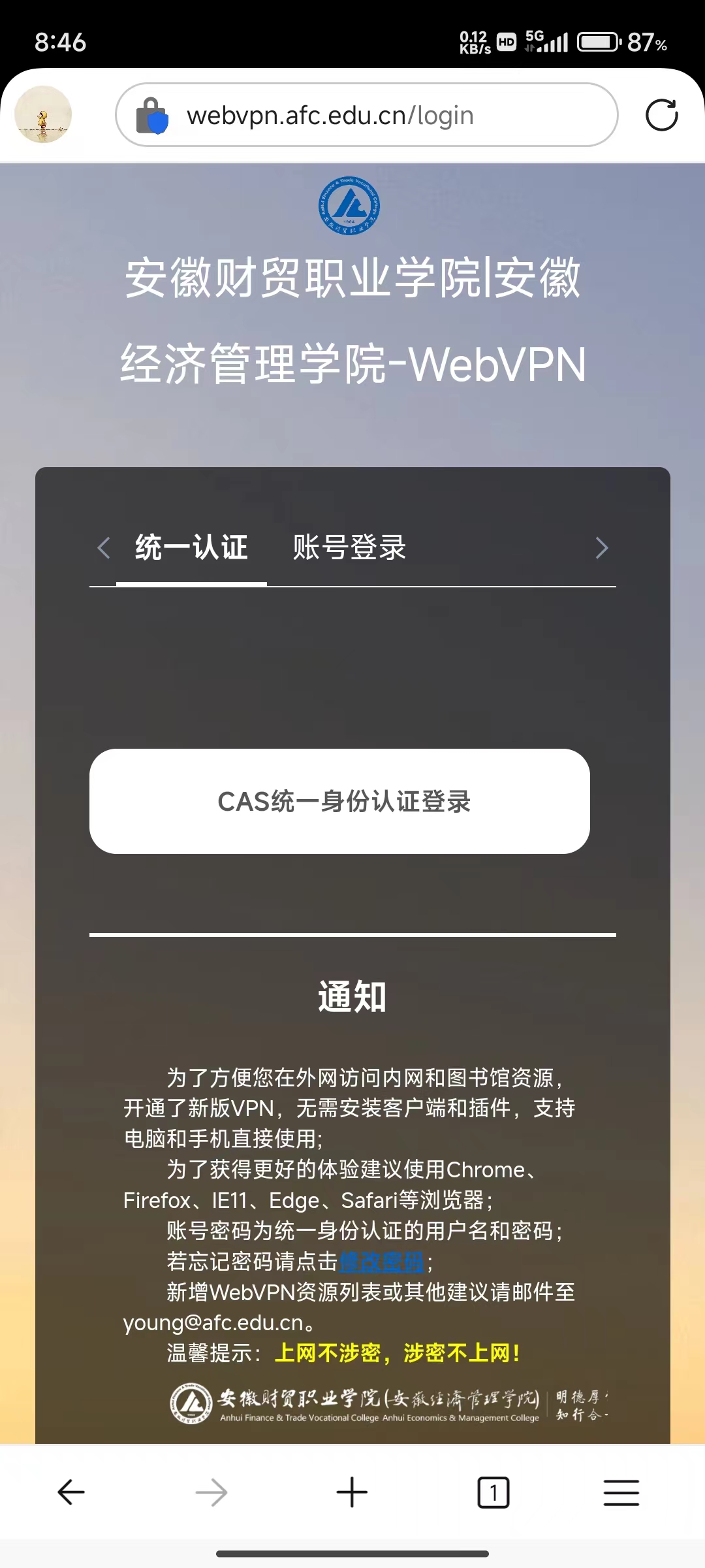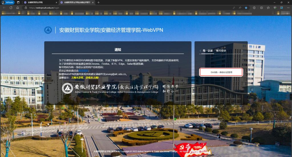 此时浏览器会进入WebVPN登录页面webvpn.afc.edu.cn,登录方式有两种,统一认证方式和账号登录方式,我校教职工使用“CAS统一身份认证登录”,部门账号或第三方账号使用“账号登录”。