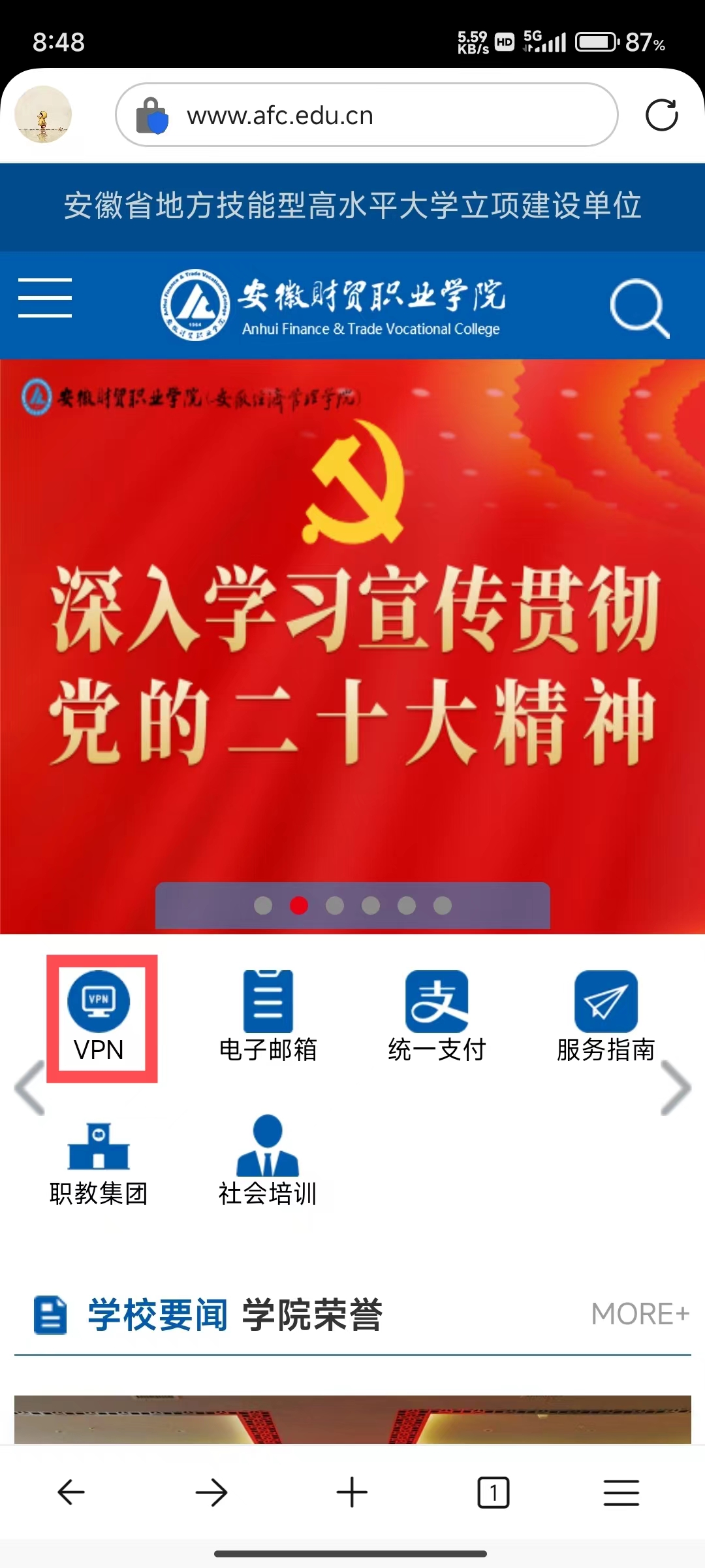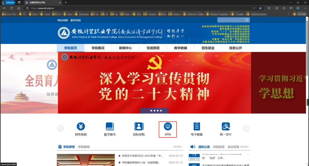 用户在校外网络(非校园网)环境下使用电脑或手机访问学校内部网络资源时,首先打开学校主页:,点击“VPN”图标,如图1所示。