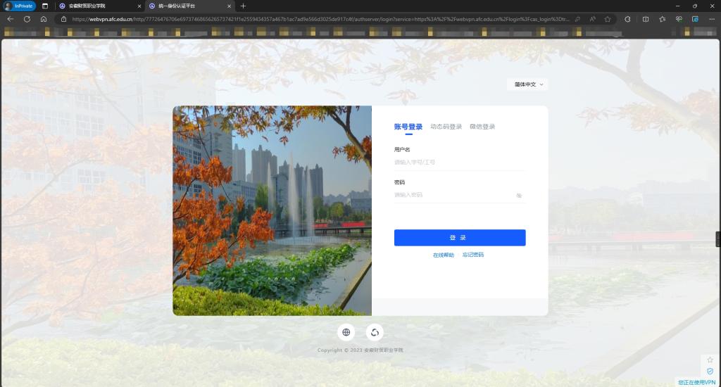 浏览器会自动弹出统一身份认证登录页面,如图3所示,在此输入您的校园网账号密码点击登录即可进入WebVPN系统。