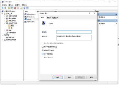 右击桌面【此电脑】,选择【管理】,在弹出的【计算机管理】窗口中找到:系统工具->本地用户和组->用户,鼠标左键双击用户找到【Guest】双击进去,把账户已禁用的勾选去掉,如图6所示。