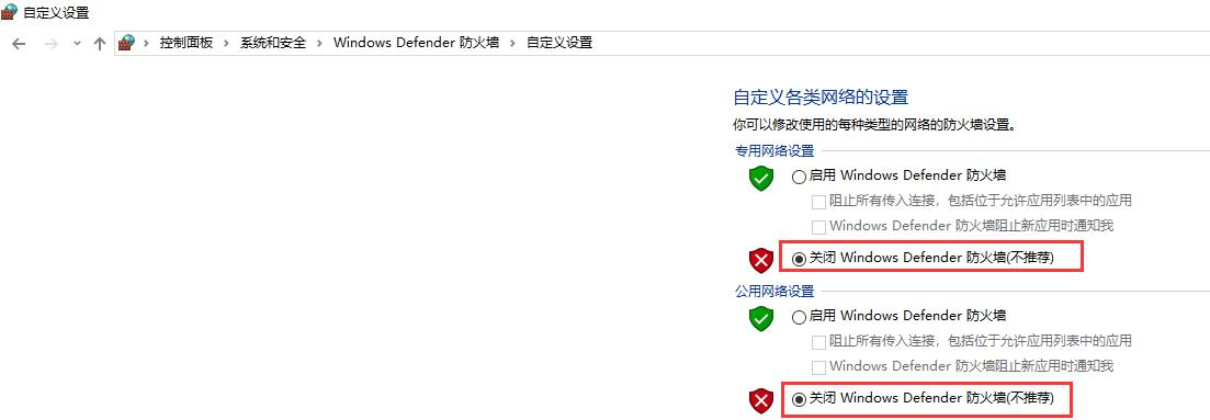 在控制面板选择系统和安全->Windows Defender防火墙->检查防火墙状态->启用或关闭Windows Defender防火墙->关闭Windows Defender防火墙,流程见下图。