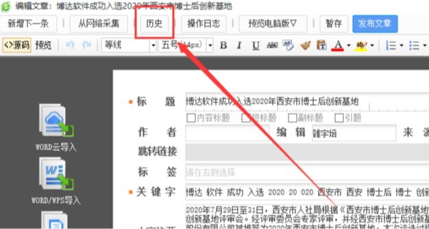 步骤一、打开文章编辑器后,点击“历史”,如图1;