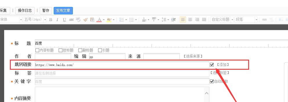 步骤二、先勾选跳转链接选择框,然后将需要跳转的链接放入链接位置,如图2。