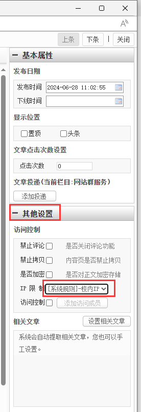 可以。在文章编辑页面打开“其他设置”,把访问控制中的IP限制设置为“系统规则-校内IP”即可。