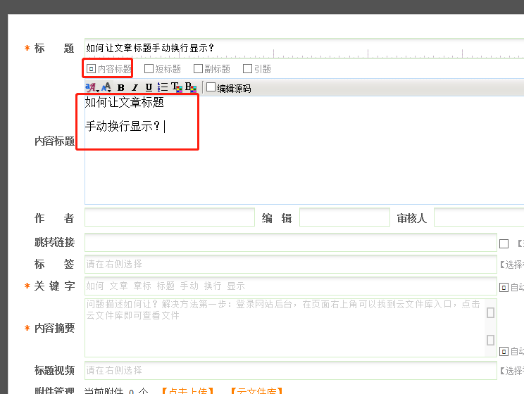 登录网站后台,在维护文章的编辑器页面,标题下面点击选中内容标题,在内容标题的文本框中输入文章标题,然后按照自己的需要进行对应换行,点击发布即可查看效果。