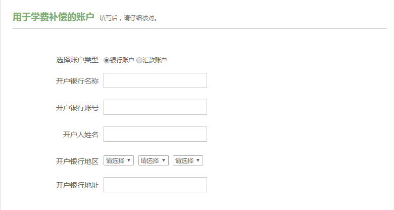 我校只允许选择银行账户方式,须是学校统一办理的中国建设银行或中国农业银行卡。开户人姓名须是学生本人。(未按要求填写或信息有误导致转账不成功的,由学生本人负责)。