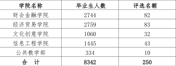 安徽省普通高等学校优秀毕业生按照在籍全日制高职专科层次毕业生总人数的3%比例评选推荐,2023年毕业生人数8342人,评选名额为250名。具体名额分配如下: