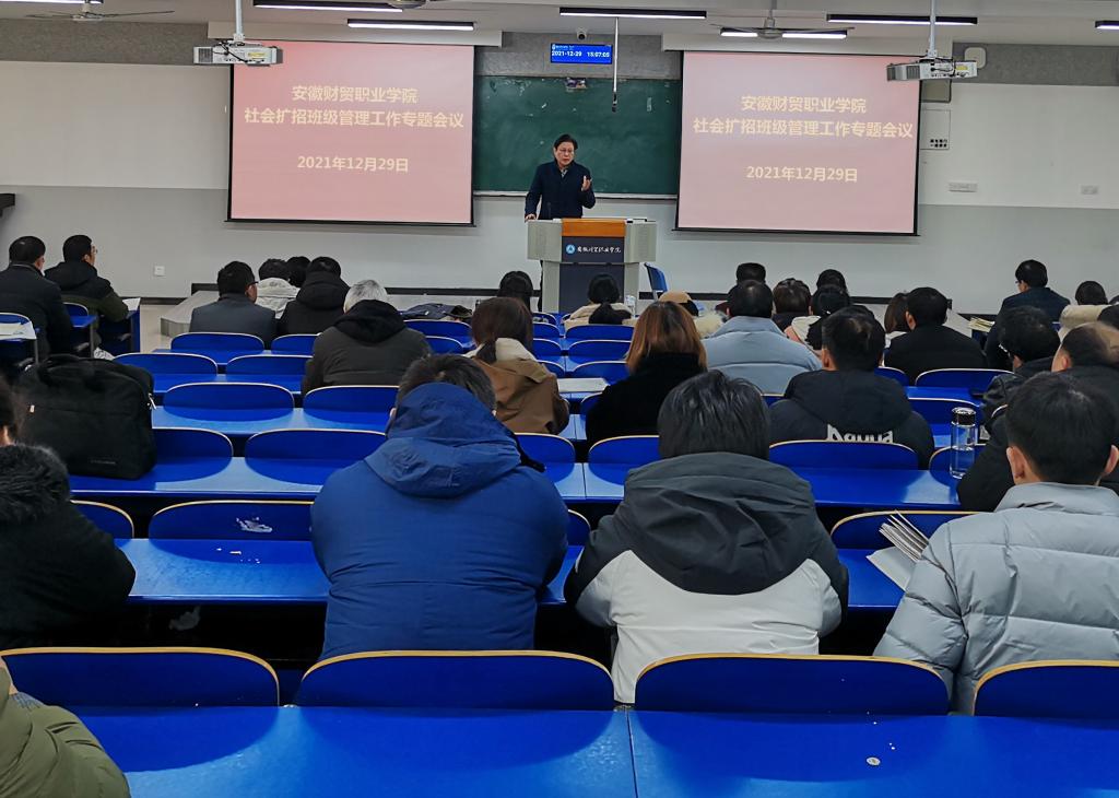 12月29日下午在6102教室,学校召开社会扩招班级管理工作专题会议,学校党委委员、副校长胡戴新出席会议并讲话,学生处、教务处、二级院部党总支书记、副书记及全体社会扩招班级辅导员参加会议。
