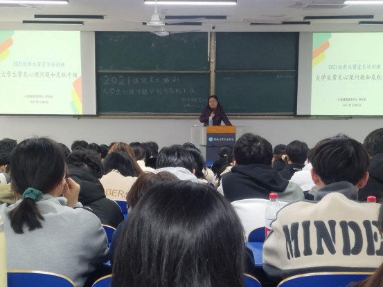 12月8号下午,学生处举办的2021级寝室长培训班专题心理讲座在6103和6202教室顺利召开,由学生处心理健康教育中心的李杉杉和王思老师担任主讲,我校全体2021级新生寝室长和各院部学生会干部共计750余人聆听了此次讲座。