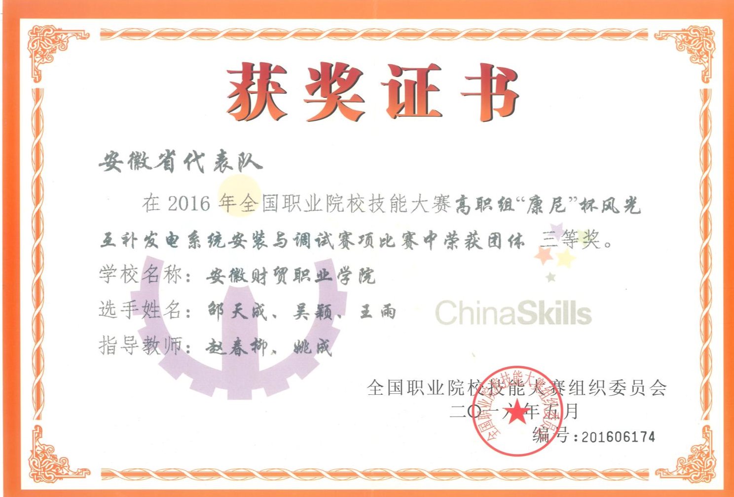 图8 2016年“风光互补发电系统安装与调试”国赛三等奖