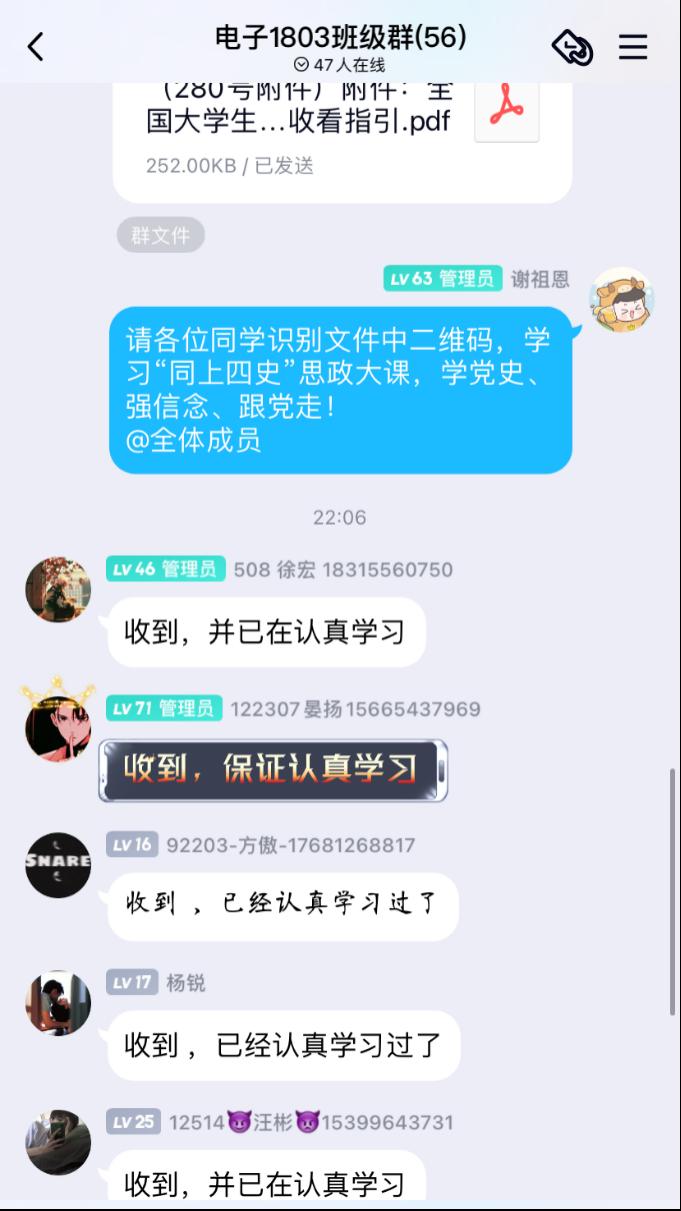4月26至29日,信息工程学院2019级、2020级同学,分别利用每天口语训练、课余时间,依托党史学习教育主题口语训练、主题班会等平台,借助班级QQ群、微信群、微信公众号、微博官方账号等,进行了系统性的理论学习。2018级同学也通过线上主题班会的形式开展学习教育。