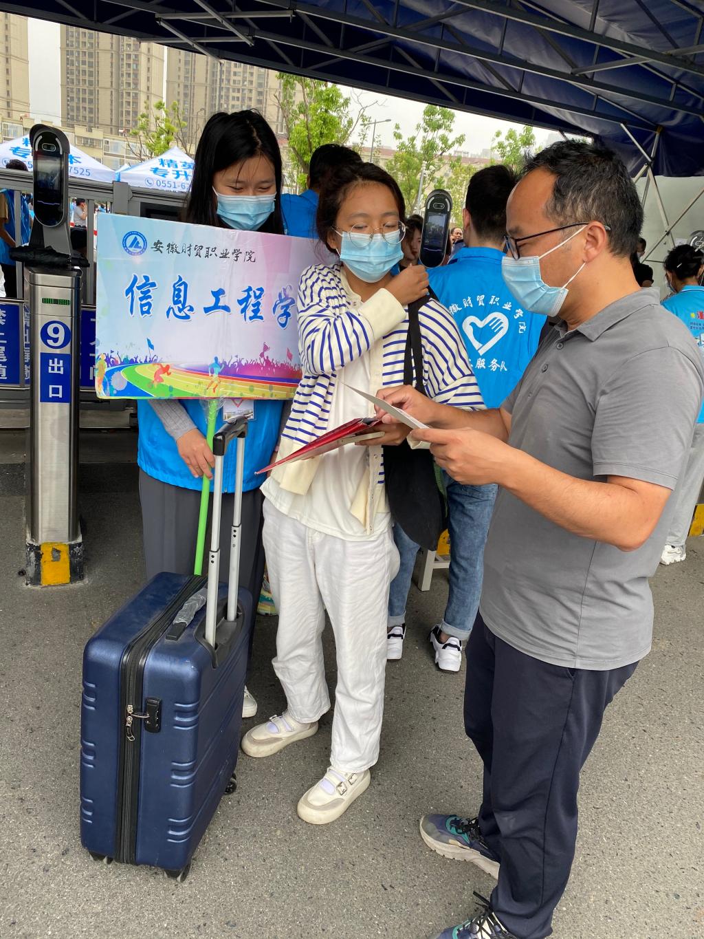 在报到的两天时间里,新生和家长一到校门口,信息工程学院热情的“蓝马夹”们立刻微笑着迎上去,“你好!欢迎来到学校”,并抢下新生和家长手中沉重的行李。根据疫情防控规定,家长不能进校,他们担忧的眼神信息工程学院看在眼里,六位教研室主任主动放弃休息时间,在校门口执勤,此种安慰更显真意。