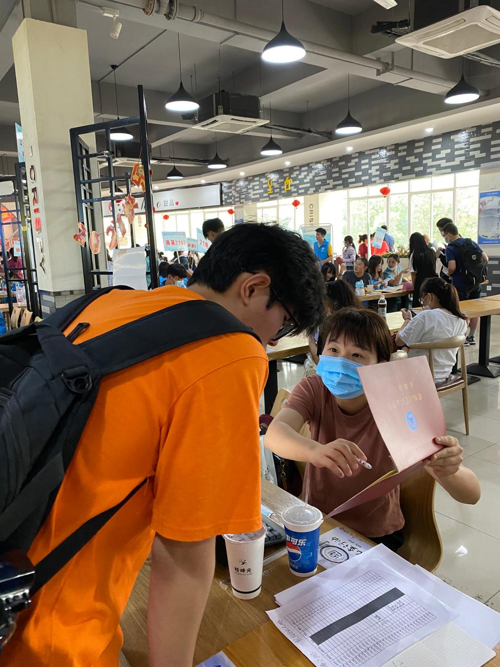 新生报到在学校食堂二楼进行,为了新生顺利报到,沿途都放置了报到指示牌,每个环节均有志愿者热情引导,悉心服务。