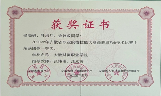 图12 2022年安徽省职业技能大赛荣获安徽省赛一等奖