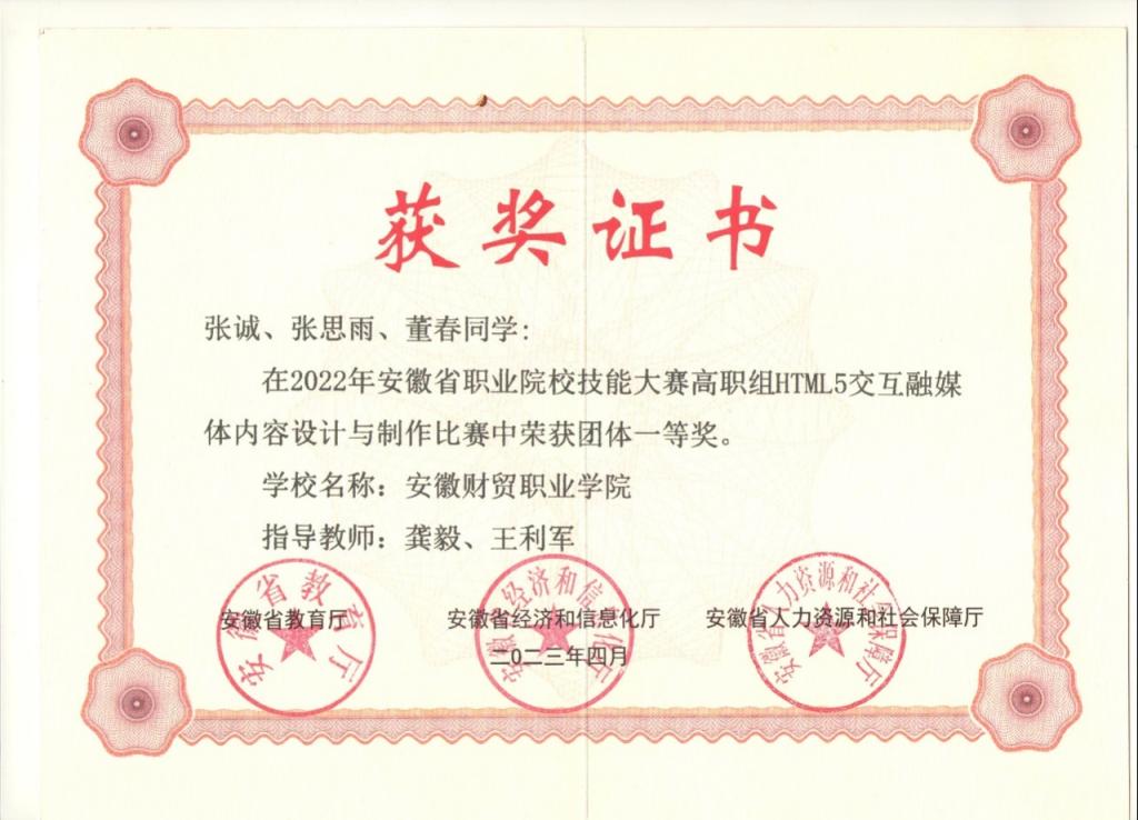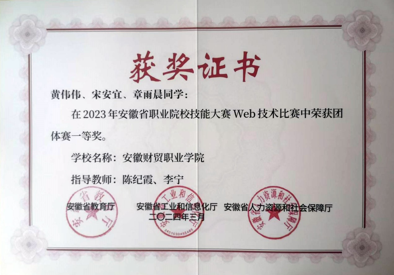 图13 2023年安徽省职业技能大赛荣获安徽省赛一等奖