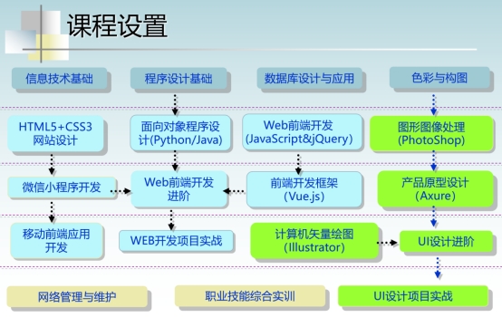 图形图像处理、用户界面和体验(UI/UE)设计、产品原型设计、HTML5+CSS3网站设计、Web前端开发、Web应用程序设计开发、移动前端应用开发和Web开发项目实战等课程。