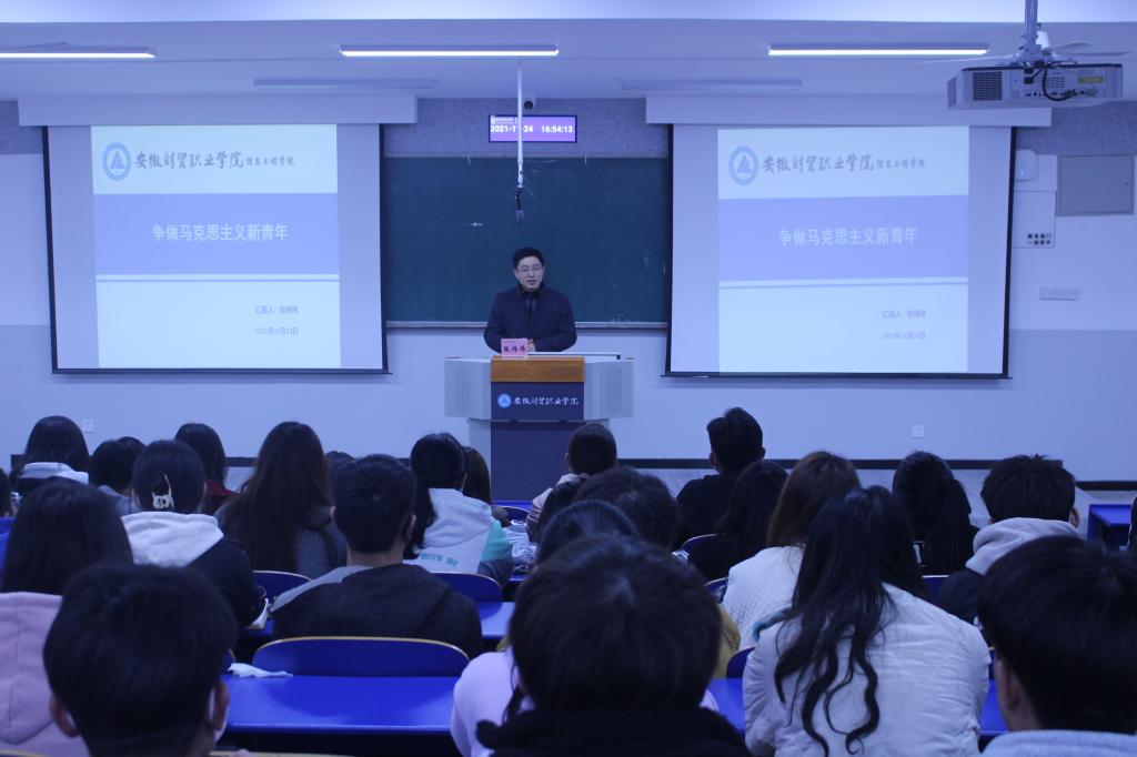 张伟伟为青马班学员讲授第一课《争做马克思主义新青年》,他从马克思主要成就、中国为什么选择马克思主义、马克思主义中国化的理论成果三个方面向同学们介绍了马克思的生平以及马克思主义,让同学们对马克思及马克思主义有了一个清晰的认识,并通生动详实的案例,深刻阐释了马克思主义中国化进程,中华民族从站起来、富起来到强起来的伟大飞跃。勉励全体学生干部要充分发挥模范带头作用,不辜负党和国家的重托,坚定为中华民族伟大复兴中国梦奋斗的决心和信心,让青春年华在为国家、为人民的奉献中焕发出绚丽光彩。