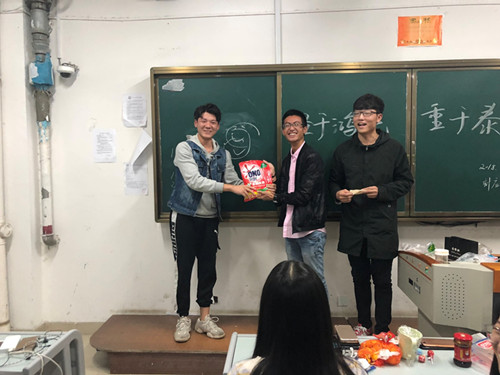 班会开始,蔡老师先让班级学生依次抽取号码,根据号码选择放有不同零食的座位,并且只能与右边同学一起分享,然后观看了名为《急诊科的故事》纪录片,并结合前段时间“重庆公交坠河事件”和大家进行一场关于责任的深刻剖析。接下来,蔡老师又带领同学们一起做“我是你的眼睛”的游戏,整个游戏凸现“责任”为主题。最后根据大家活动的参与度进行评奖活动,一等奖两名,二等奖三名,三等奖四名,以及优秀奖若干。