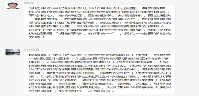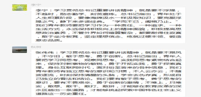 在学习讲话后,各位老师畅所欲言,将自己的感受发表到微信群中,指出培育、引领学生是当代教师的重要责任,尤其是培养和训练青年的科学思维方法和思维能力,对教学方法改革很有触动。作为教师,要德才兼修为青年人成长提供垫脚石,要兼修高尚的道德情操和坚实的专业技能,做到以德施教、以情育人。