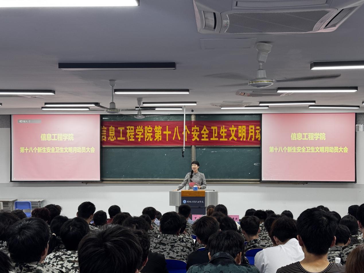 为进一步加强新生文明素养教育,养成良好的行为规范,深入推进安全文明卫生月活动,信息工程学院于10月15日开展了第十八个安全文明卫生月动员大会,党总支副书记丁蓉、团总支书记岳吉方、全体专职辅导员及24级班长、劳动委员和寝室长参加此次会议。