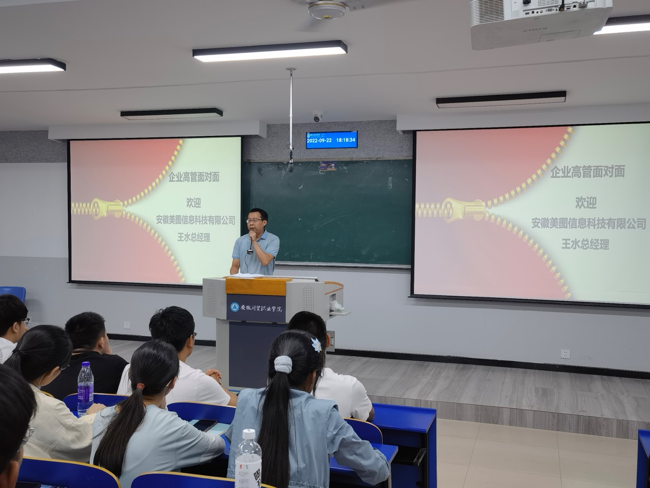 教研室主任陆慧老师从专业内涵和发展、人才社会需求、人才培养目标、主要课程及实践项目、大学生活、学习方法等方面做重点阐述。同时,邀请优质校企合作企业安徽美图信息科技有限公司王水总经理向新生介绍了行业企业对人才的需求。