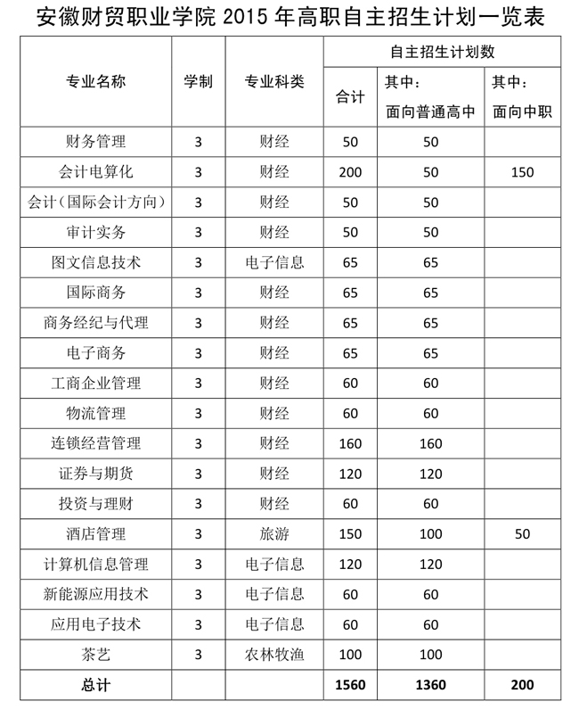 近日,学院2015年高职自主招生计划经安徽省教育厅审批发布,共计1560人,其中面向普通高中招生1360人,面向中职招生200人。
