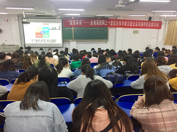 11月14日下午,学校组织开展“就有未来”全省高校同上一堂就业指导课大型公益网络直播活动。校长助理吴晓光、招生就业处、各二级学院党总支书记、学生秘书、专职辅导员、毕业班辅导员和学生代表等共计350余人共同收看了这堂就业指导课网络直播。