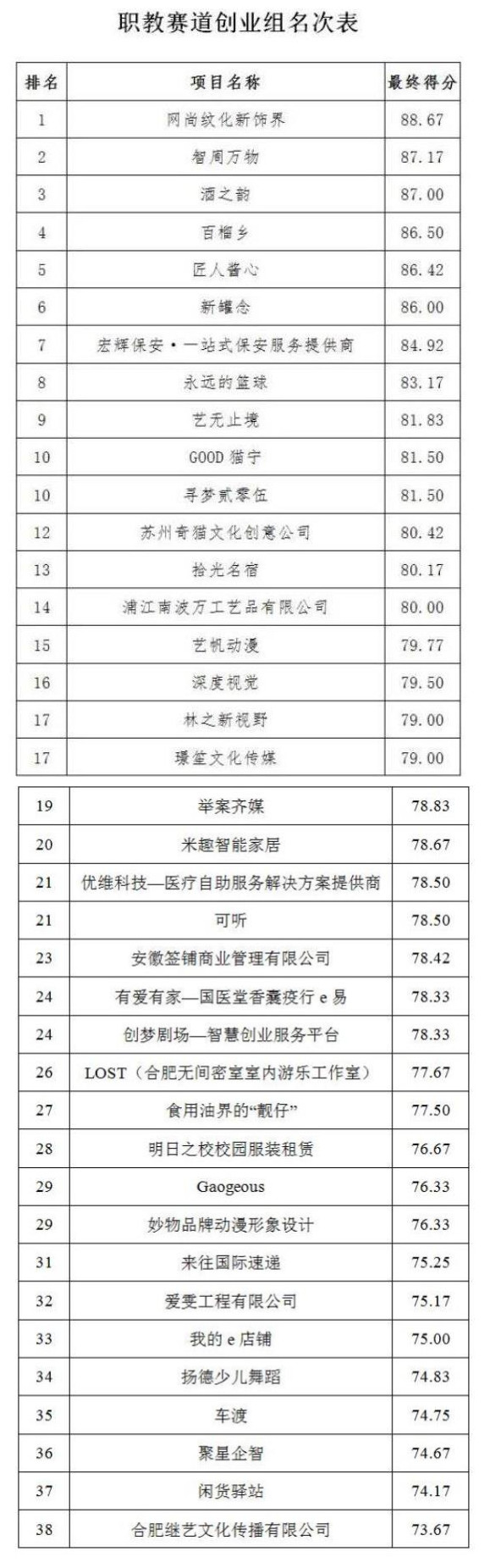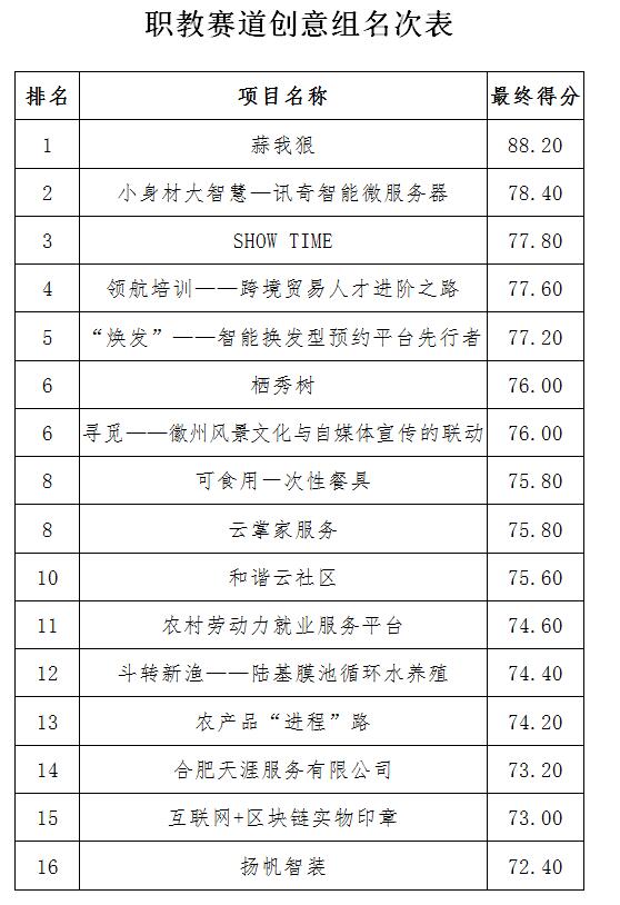 根据beat365在线唯一官网第六届“互联网+”大学生创新创业大赛总决赛的赛程安排,学校于8月1日分别举办了第六届“互联网+”大学生创新创业大赛总决赛的职教赛道创意组、创业组和青年红色筑梦之旅赛道公益组和商业组的比赛。现将总决赛的比赛成绩予以公示。