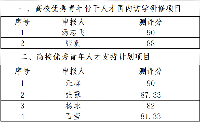 根据《安徽省教育厅关于做好2022年度高校优秀拔尖人才培育项目立项工作的通知》(皖教秘人〔2022〕11号)和《beat365在线唯一官网关于申报2022年度高校优秀拔尖人才培育项目工作的通知》(组发〔2022〕3号)文件精神,经过教师申报、职能部门初审、专家评审等程序,现将评审推荐结果公示如下: