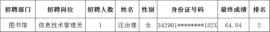在2021年度学院公开招聘聘用制人员体检考察阶段,因图书馆信息技术管理员岗(201230)第一名考生放弃,该岗位空缺1人。根据《beat365在线唯一官网2021年度公开招聘聘用制人员公告》,依据考生最终成绩从高分到低分排名结果,按照1:1比例等额递补第二名考生进入资格复审,现予以公布。资格复审合格后,将进入体检及考察政审阶段。