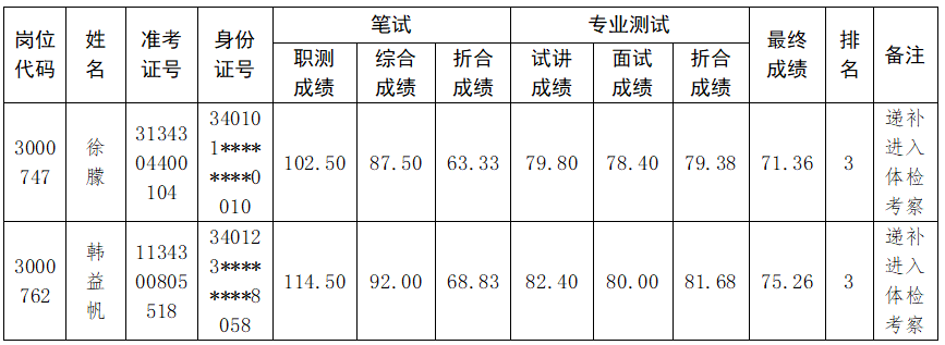 在学院2024年度省直事业单位公开招聘工作人员体检考察阶段,因考生放弃体检政审等原因,3000747专业技术岗位和3000762管理岗位分别缺额1人,根据《关于印发2024年度安徽省直事业单位统一笔试公开招聘工作人员实施方案的通知》《beat365在线唯一官网2024年度省直事业单位公开招聘工作人员专业测试及有关工作实施方案》要求,按照考生最终成绩从高分到低分排名结果,按照1:1比例等额递补进入体检考察人员,递补考生信息如下。