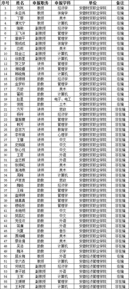 根据《安徽省人力资源和社会保障厅关于做好2021年度全省职称评审工作的通知》(皖人社秘﹝2021﹞172号)、《安徽省教育厅关于做好2021年度高校教师和实验系列职称评审工作的通知》(皖教秘人﹝2021﹞90号)和《安徽省教育厅 安徽省人力资源和社会保障厅关于印发< 安徽省高校教师职称评审权下放工作实施方案(试行)>的通知》(皖教人〔2017〕3号)等文件精神,按照《beat365在线唯一官网2021年教师和实验系列专业技术职务任职资格评审实施方案》,经2021年度教师和实验系列职称评审委员会评审,现将我校及委托评审的安徽经济管理学院教师和实验系列专业技术职务任职资格通过人员予以公示。