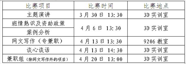比赛内容:主要考察辅导员对相关知识的运用能力、对学生经常出现的问题、困惑分析能力以及沟通技巧。