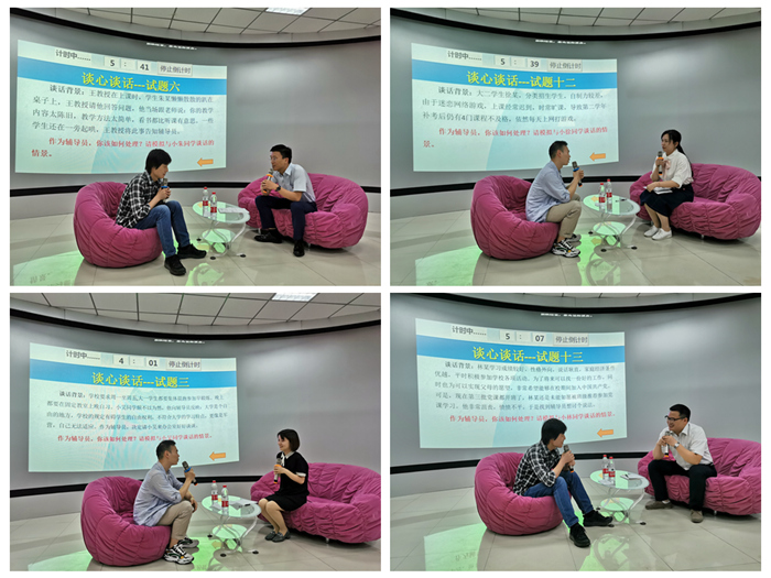 谈心谈话比赛主要考察辅导员对相关理论政策、学生特征、学生成长成才规律的了解把握,以及对问题的解决能力和对学生的教育引导能力。比赛采取现场抽题方式,提前10 分钟抽题,从14道题中现场任意抽取一题作答,限时6分钟,以情景再现的方式开展谈心谈话。参赛辅导员准确把握问题核心,运用心理学、教育学等专业知识及自身工作经验深入分析,巧妙应对,顺畅沟通,合理解答,展示参赛辅导员的教育引导能力和现场掌控能力。