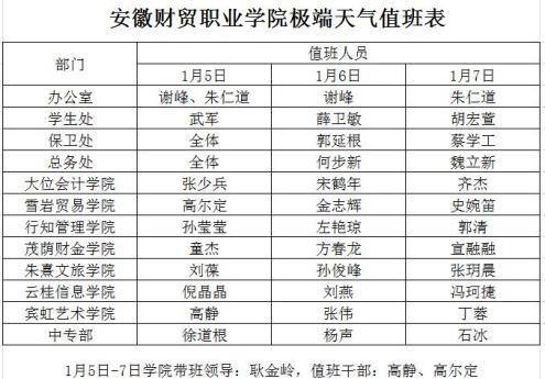 二、1月5日,总务处、保卫处全员上班,办公室、学生处、各二级学院安排1名人员值班。