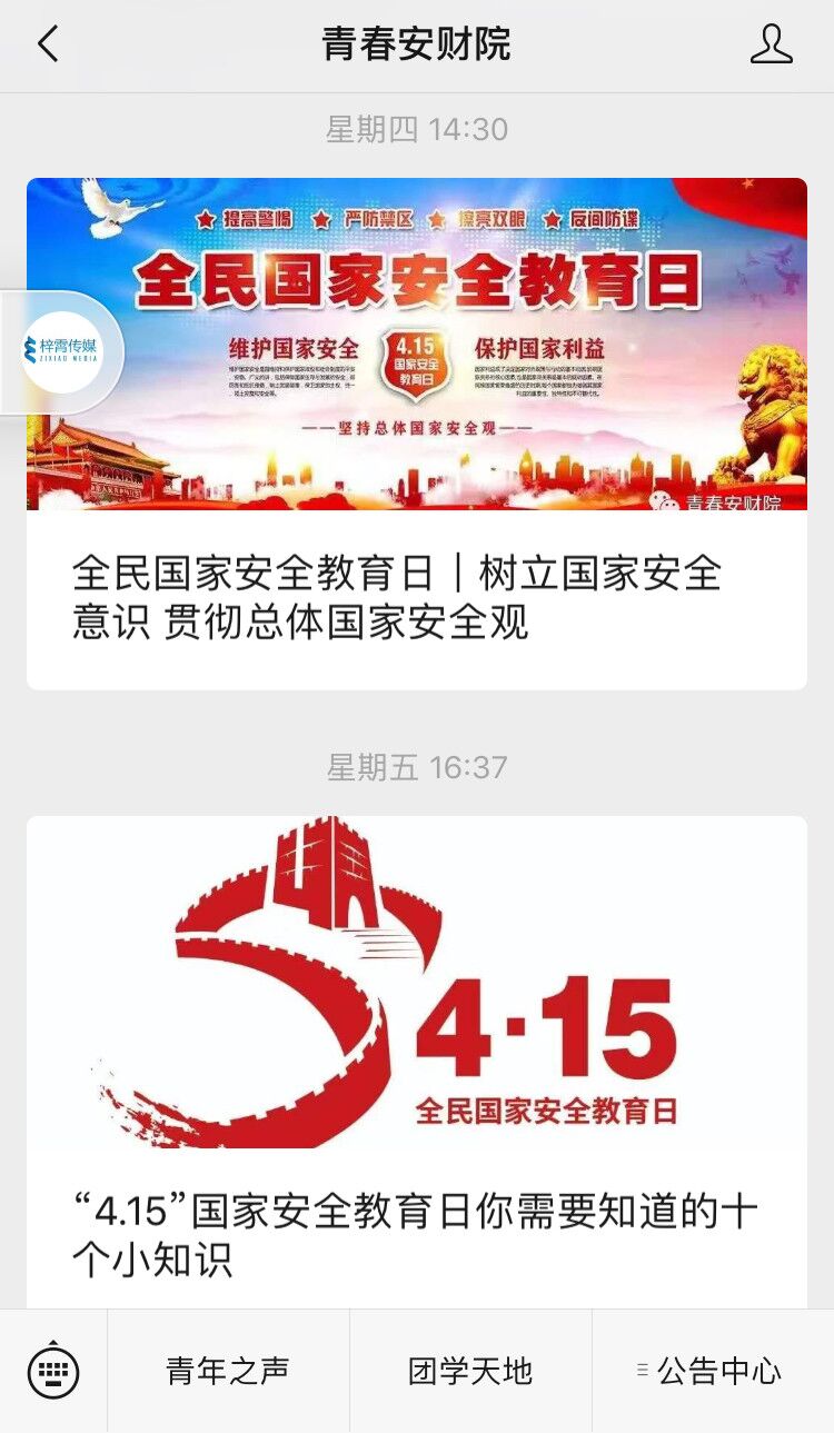 本次宣传教育活动以教育日主题“践行总体国家安全观,统筹发展和安全,统筹传统安全和非传统安全,营造庆祝建党100周年良好氛围”为指导,各院部团支部积极响应,通过开展主题团日活动、团总支书记讲团课等形式,引导班级团员青年深化国家安全观,将宣传效果落到了实处。团委通过微信公众号“青春安财院”推送多篇国家安全教育主题宣传材料,多角度、全方位的帮助我们的同学们了解危害国家安全的各种不利因素以及公民在国家安全中应尽的义务等,切实巩固了全体师生的总体国家安全观。为发挥高校校园“主阵地”宣传作用,团委还通过展示“反邪教”宣传展板,向广大青年宣传反邪教相关知识,提高同学们反邪教的意识和能力。
